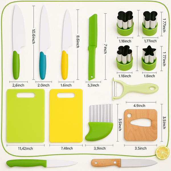 Includes child-safe versions of kitchen must-haves — from a wooden knife and cooking knife to sandwich cutters, crinkle cutter, cutting boards, and a peeler!
