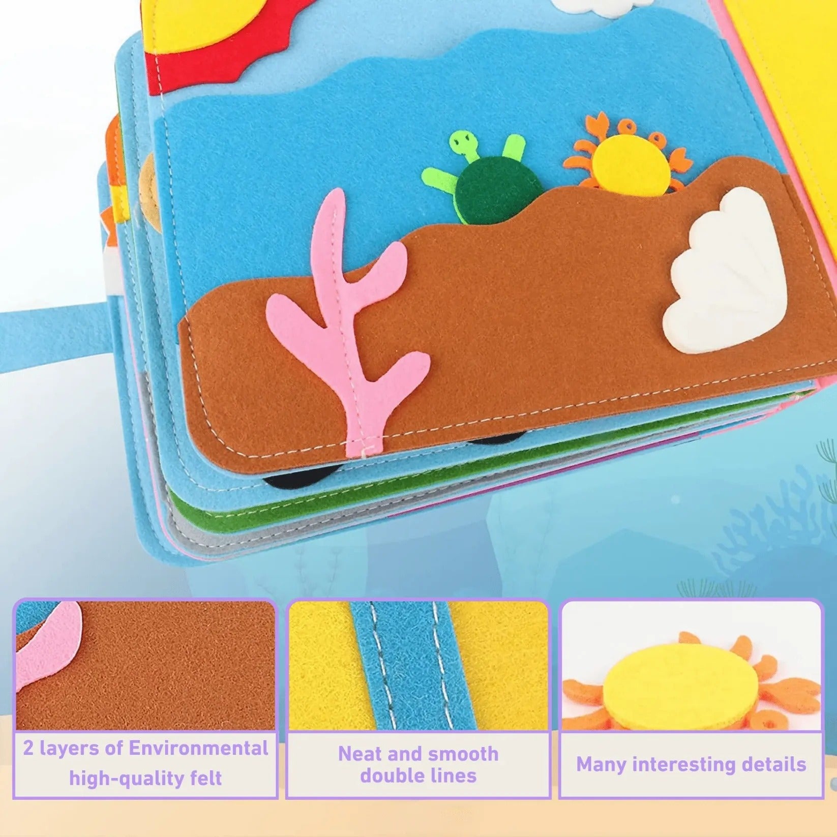 Each page is thoughtfully crafted with touch-and-feel felt pieces, moveable elements, and play-based learning activities that strengthen a child’s imagination and develop independent problem-solving skills.